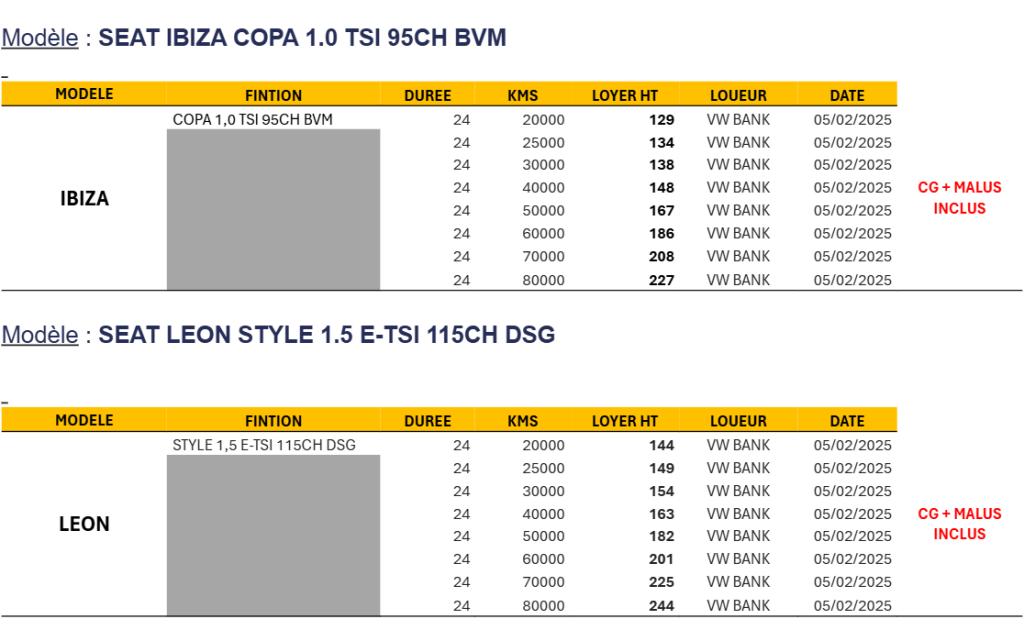 Offre valable du 06/02/2026 au 28/02/2026. Perte Financière incluse. Contrat de Maintenance aux Professionnels avec Véhicule de Remplacement. Dans la limite des stocks disponibles.Perte Financière obligatoire coût mensuel de 8,14 € inclus dans les loyers. Assurance souscrite auprès de MMA IARD Assurances Mutuelles – Société d’assurance mutuelle à cotisations fixes – RCS Le Mans 775 652 126 et MMA IARD – Société Anonyme au capital de 537 052 368 euros -RCS Le Mans 440 048 882 – sièges sociaux : 14 bvd Marie et Alexandre Oyon – 72030 Le Mans cedex 9. Entreprises régies par le code des assurances. (3) Contrat de maintenance obligatoire, coût mensuel de 20,26 € inclus dans les loyers souscrit auprès de VOLKSWAGEN BANK GmbH.(4) Garantie Véhicule de Remplacement incluse dans les loyers, souscrite auprès d’Europ Assistance France SA – RCS Nanterre 451 366 405 : Entreprises régies par le Code des assurances et soumises à l’Autorité de Contrôle Prudentiel (ACP) – 61 rue Taitbout 75009 PARIS. Ces offres sont réservées à la clientèle professionnelle, hors taxis, loueurs et flottes, chez tous les Distributeurs SEAT présentant ce financement, sous réserve d’acceptation du dossier par SEAT Fleet Solutions division de VOLKSWAGEN BANK GMBH – SARL de droit allemand – Capital social : € 318279 200 – Siège social : Braunschweig (Allemagne) – RC/HRB Braunschweig : 1819 – Intermédiaire d’assurance européen : D-HNQM-UQ9MO-22 (www.orias.fr) – Succursale France : Bâtiment Ellipse, 15 avenue de la Demi-Lune – 95700 Roissy-en-France – RCS Pontoise : 451 618 904 -Administration et adresse postale : 11, avenue de Boursonne – B.P. 61 – 02601 Villers-Cotterêts Cedex. Montants exprimés HT, hors prestations facultatives. À partir du 1er septembre 2018, la procédure WLTP remplace complètement le nouveau cycle européen de conduite (NEDC), procédure d’essai utilisée précédemment. Les conditions d’essai étant plus réalistes, la consommation de carburant et les émissions de CO2 mesurées selon la procédure WLTP sont, dans de nombreux cas, plus élevées que celles mesurées selon la procédure NEDC.